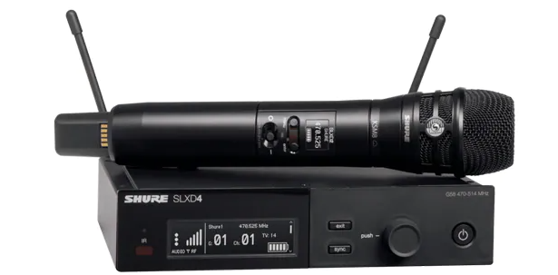SHURE製シングル受信機SLXD4とハンドヘルド型送信機SLXD2/K8Bのセット。ボーカルからスピーチ、プレゼンなど、さまざまな用途に使用可能です。